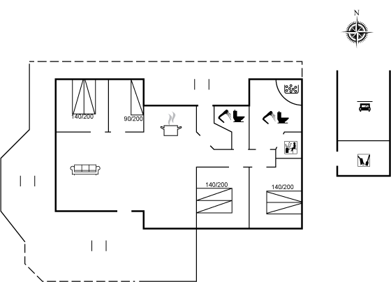 Huset ligger i dejlige Grønhøj på en ugenert grund med mange skønne terrasser, som fordeler sig omkring huset. Her er der næsten altid mulighed for at finde sol, læ og ro til at nyde ferien med en god bog eller se de yngste boltre sig i haven. Sommerhuset ligger kun en kort gåtur fra stranden og her kan man rigtig nyde de åbne vidder og skulle vinden bide lidt, så kan man glæde sig til at komme hjem til huset og varme sig ved brændeovnen med lidt varm kakao.