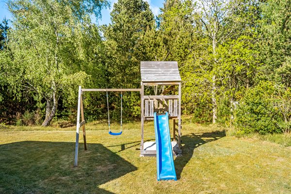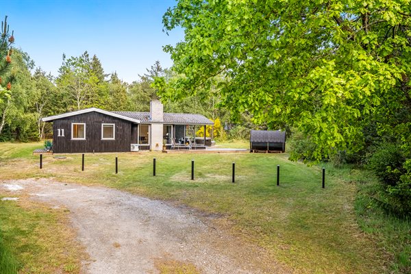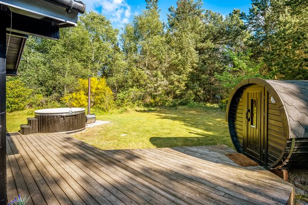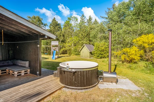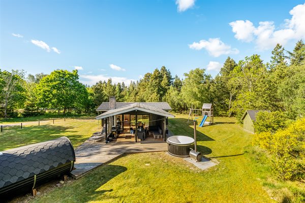Sommerhuset ligger på en mere end 2.800 kvadratmeter stor naturgrund for enden af en blind vej, med høje træer, der giver en fornemmelse af, at man er alene i naturen samt skærmer grunden og sørger for læ og privatliv. Her midt i den vestjyske natur, kan I forkæle jer selv med en tur i saunaen eller ved at tænde op i vildmarksbadet og tilbringe en aften i det varme vand under stjernehimlen. Rundt om sommerhuset er der flere terrasser og hyggelige siddekroge – blandt andet en overdækket. Til de yngste findes der sandkasse, gyngestativ og legetårn.