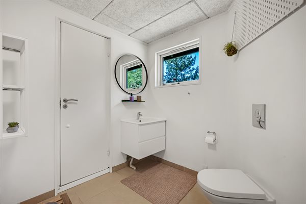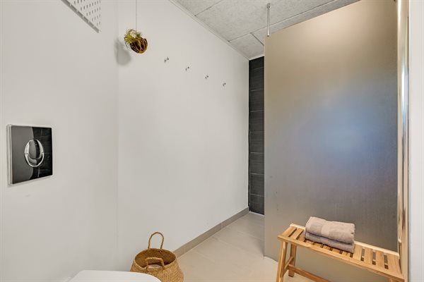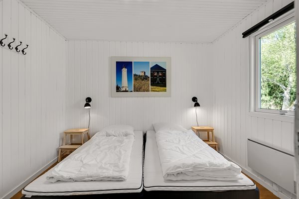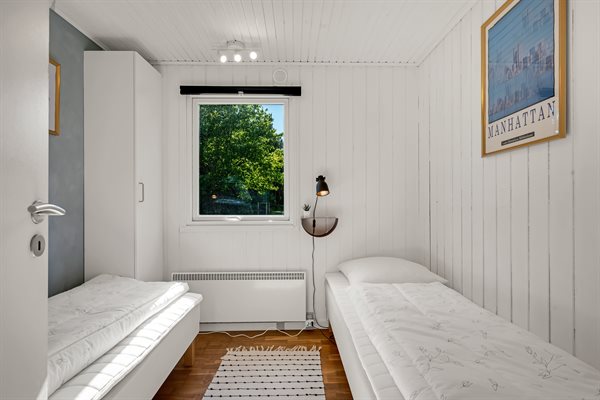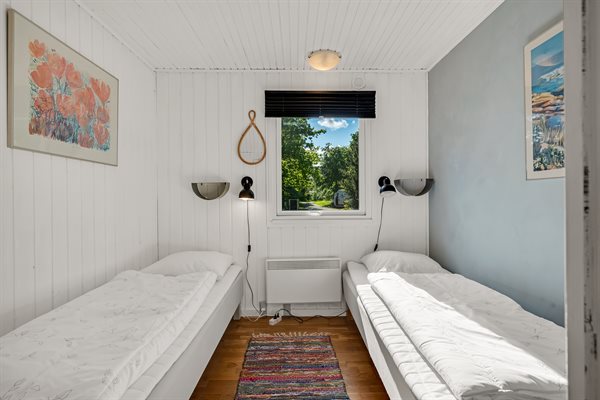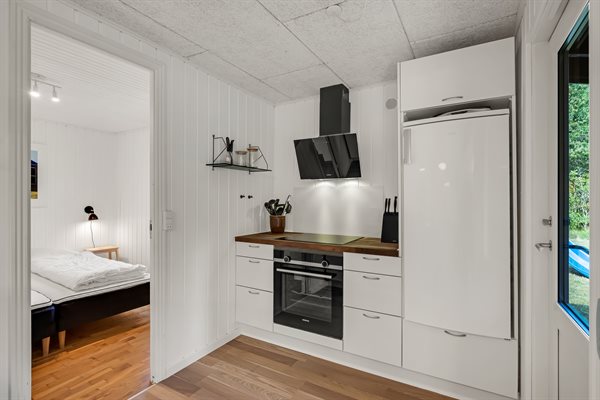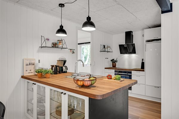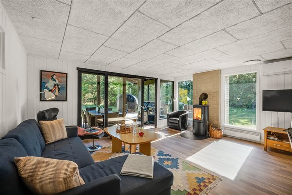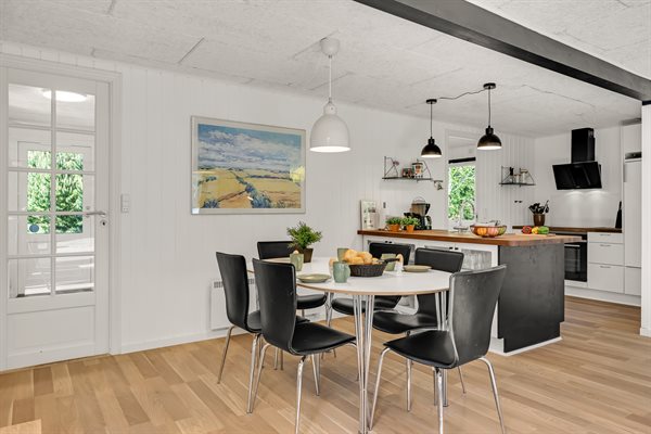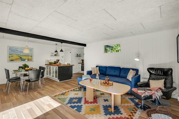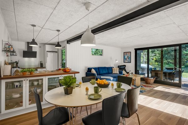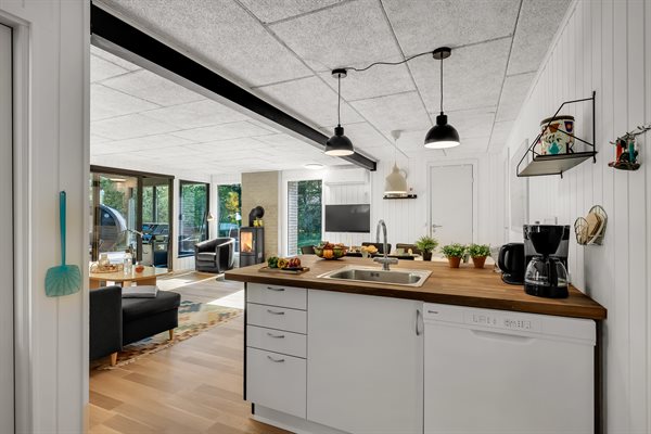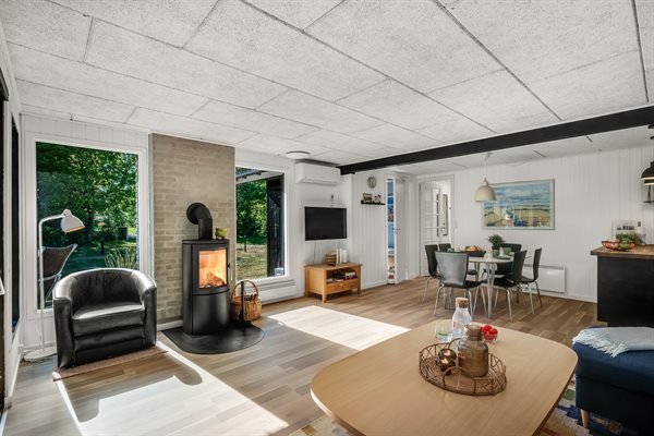 Sommerhusets hjerte er den kombinerede stue- og køkkenalrum. Her kan hele familien samles til lækre feriemiddage rundt om spisebordet og hyggelige feriestunder foran brændeovnen. Opvaskemaskinen tager sig af opvasken så alle kan fokusere på samvær og hygge.