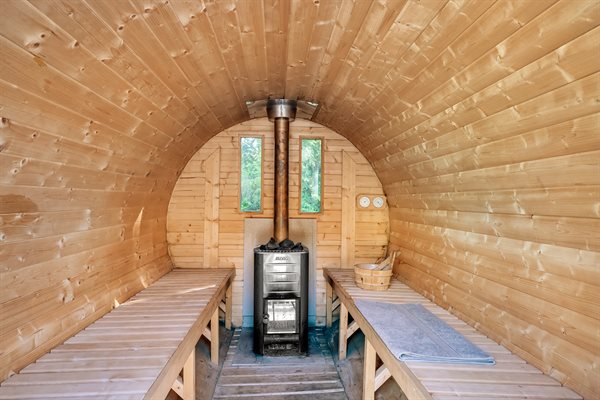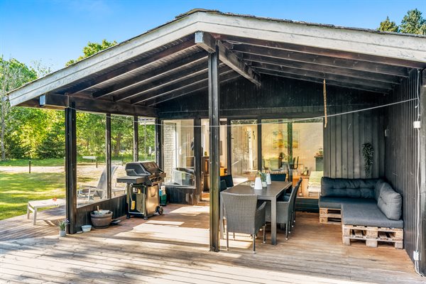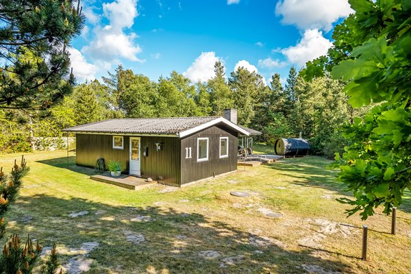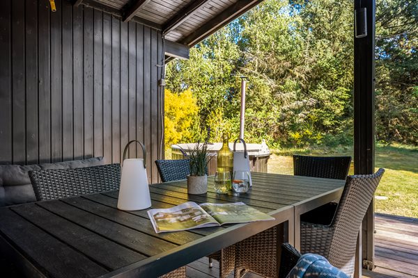 Her er der fokus på rigtig sommerhushygge med blandt andet brændeovn og opvaskemaskine samt et stort udeareal med overdækket terrasser. Huset er beliggende på en stor grund for enden af en lukket vej og omgivet af fyrretræer - her har I jeres egen udendørs luksus-hygge med både udendørs sauna og vildmarksbad. Muligheden er der for at I kan skabe jeres egen lille wellness ferie.
