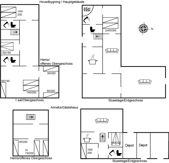 Hovedbygningen, der er omgivet af græsplæner, terrasser og læpladser, består af to længer samt af et L-formet annekshus, i alt ca. 300 m2. Der bydes på klassisk og hyggelig vestkyst-stemning og udsøgt landlig stil. I 2004-2006 blev husene totalrenoveret indvendigt med bevarelse af de oprindelige ydervægge og træværk i tømmer fra strandingsgods. Alt indvendigt er helt tidssvarende med gulvvarme, helårsisolering, nye badeværelser og to nye køkkener (et i hovedbygningen og et i annekset). Alt er holdt i den oprindelige stil, ligesom husets udvendige facade og stråtag, som Varde Kommune har bestemt bevaringsværdigt. Af de 16 sovepladser findes der én i en alkove og to efter gennemgang af et andet soveværelse.