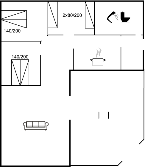 Sovepladserne fordeler sig på 3 værelser: 2 med dobbeltseng (140 x 200 cm) samt 1 med 2 enkeltsenge (80 x 200 cm). Af yderligere udstyr kan gratis, trådløs internetforbindelse (computer skal medbringes) og vaskemaskine nævnes.