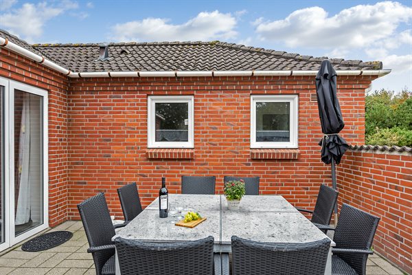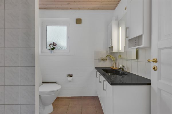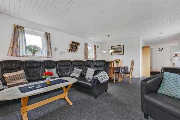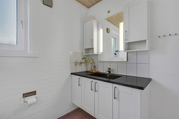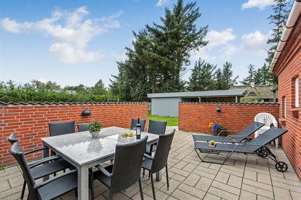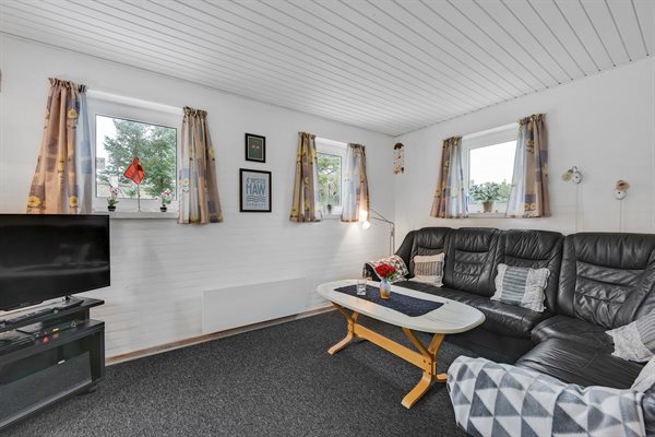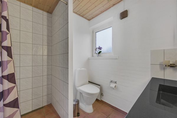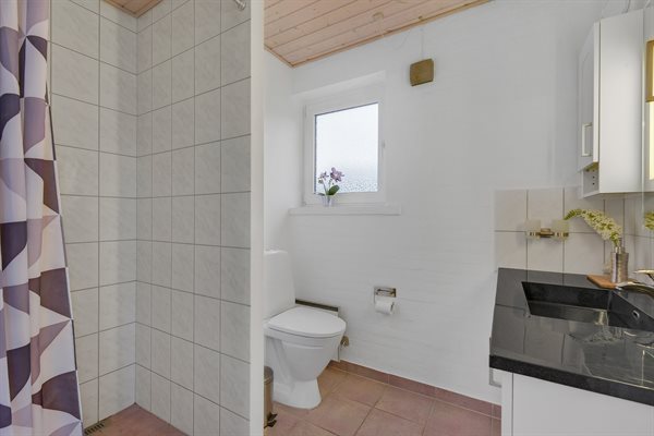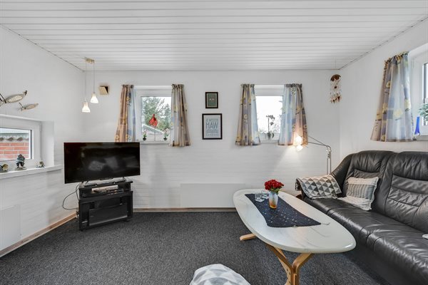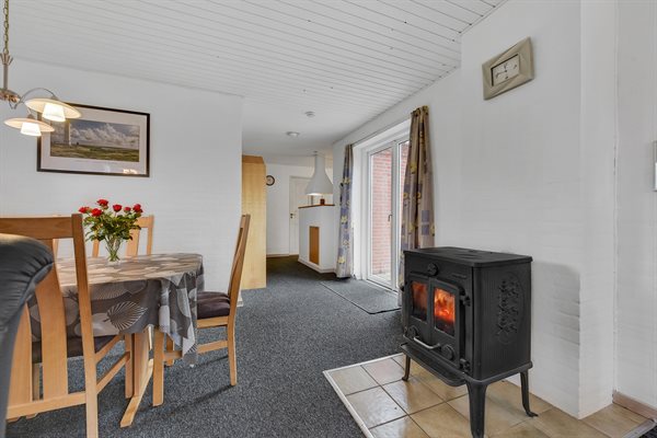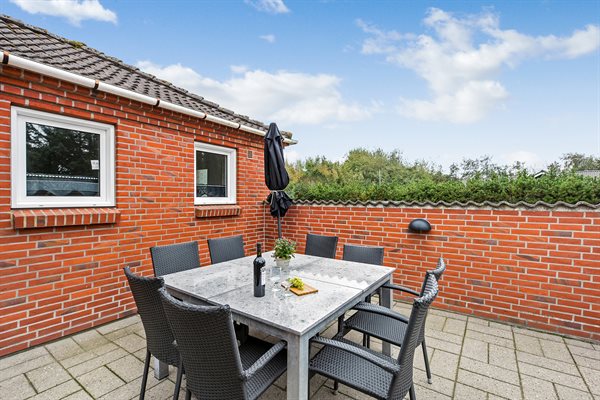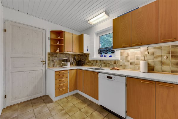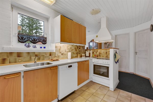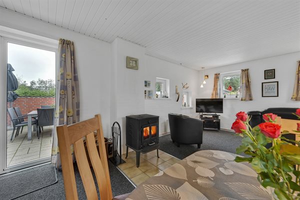 Til sommerhuset hører afskærmet, flisebelagt terrasse med havemøbler. Indvendig er der vandskurede vægge. Lyst og nyrenoveret badeværelse (2015) med bruseniche og opvarmet klinkegulv. Køkkenet er bl.a. udstyret med opvaskemaskine, mikrobølgeovn og fryser. Den hyggelige opholdsstue indeholder brændeovn (med børnegitter), TV med parabol (digital), surroundsound-anlæg, DVD-afspiller samt stereoanlæg med CD-afspiller. Fra stuen er der desuden udgang til husets terrasse.