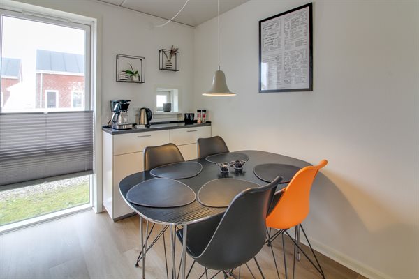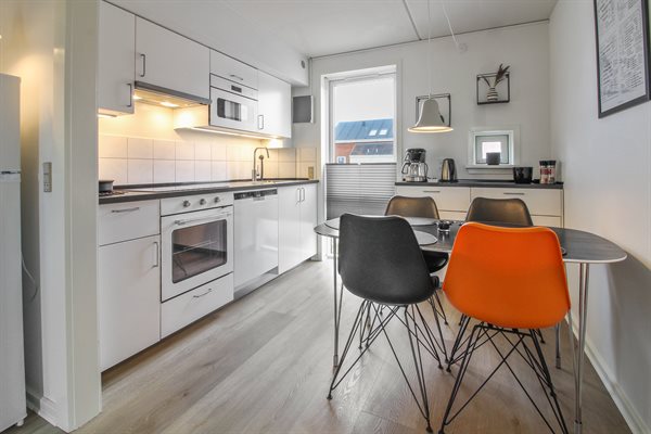 Det veludstyrede køkken råder over 1 køle/fryseskab. Frysekapacitet på 41 liter / kølekapacitet på 163 liter, 4 induktionskogeplader, varmluftovn, mikrobølgeovn samt opvaskemaskine. En høj stol og børneservice til de små.