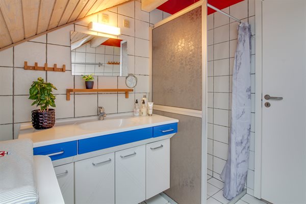 Der er 1 badeværelse med bruseniche og 1 toilet samt et puslebord til familiens mindste.