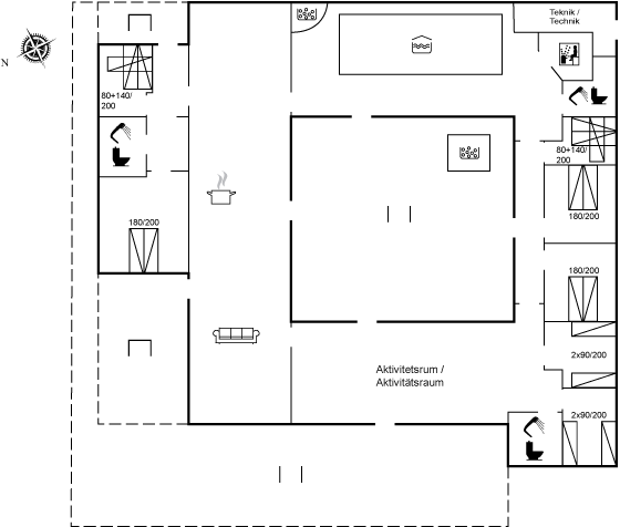 Grundplanen består af 4 længer, hvor der i midten findes en gård med et udendørs spabad. Her kan man nyde solen på terrassen eller i det varme vand, uden at blive forstyrret af naboer eller forbipasserende.