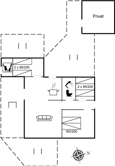 Bemærk, at den ene soveplads er på en madras i det ene værelse.