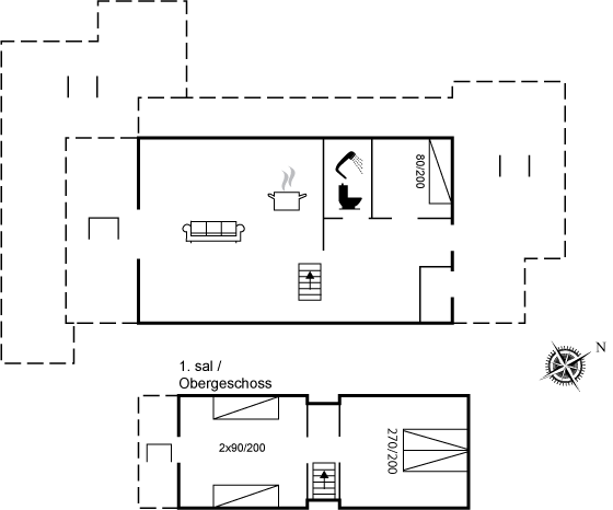 Bemærk at der er i alt 7 senge, hvoraf den ene er i juniorstørrelse, og den anden består af en meget bred seng med 3 stk. sammensatte senge, så der er flere sovemuligheder. Huset må dog kun bookes til max. 5 personer! En stejl trappe fører op til husets 1. sal.