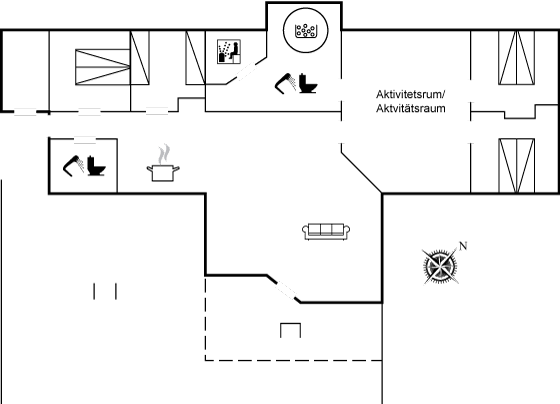 Sommerhuset har ydermere en skøn stor, lukket og overdækket terrasse med masser af plads til at sole sig, grille og hygge i mange timer. På grunden er der desuden fodboldmål. Aktivitetsrummet byder på billard, dart og poolbord, hvor man kan more sig med venner og familie.
