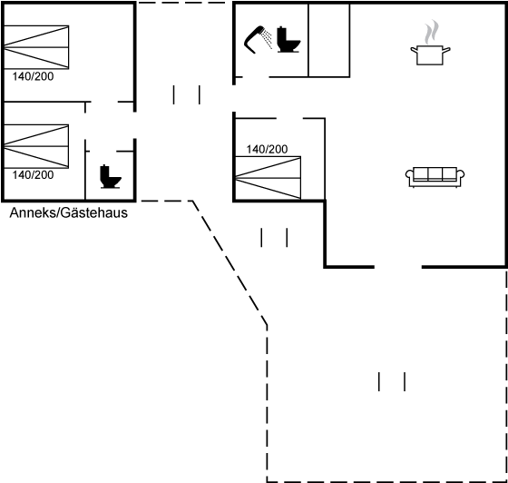 Til huset hører et stort og nybygget anneks, som er indrettet med 2 soveværelser, begge med dobbeltseng samt et gæstetoilet. Der findes endnu et soveværelse med dobbeltseng i hovedhuset.