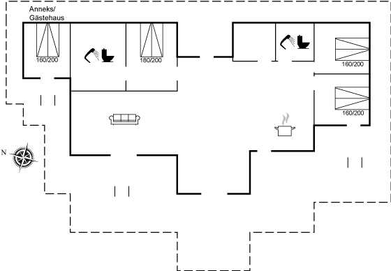 Det flotte køkken er kombineret med spisepladsen og opholdsstuen og er dermed det naturlige samlingssted for hygge og samvær. Huset er indrettet med 3 gode soveværelser, alle med dobbeltsenge samt 2 badeværelser med bruseniche og gulvvarme. I det ene badeværelse er der også badekar. På grunden findes der et anneks, som er indrettet med dobbeltseng (se grundplan). Når man kommer ud af annekset, skal man gå ca. 15 meter rundt om sommerhuset for at nå frem til hoveddøren.