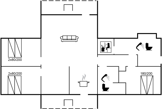 Sommerhusets køkken er i åben forbindelse med spisestue og opholdsstue. Der findes 2 badeværelser.
