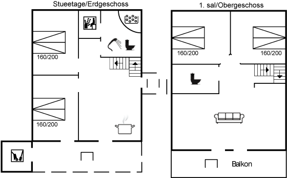 Til huset hører en stor åben terrasse med havemøbler og balkon. I stueetagen er der et dejligt badeværelse med bruseniche, 2-pers. spa og sauna. Lækkert køkken, der er kombineret med spisestuen, med bl.a. opvaskemaskine, mikrobølgeovn, fryser, varmluftovn og komfur med keramiske kogeplader. 2 soveværelser med dobbeltseng. Fra såvel køkken som fra det ene soveværelse er der udgang til den overdækkede terrasse. Midt i huset fører en trappe op til 1. sal, hvor I finder en velindrettet opholdsstue med udgang til balkon. Opholdsstuen er bl.a. indrettet med brændeovn, TV tilsluttet fællesantenne, DVD-afspiller og radio. På 1. sal findes der endvidere gæstetoilet med vaskemaskine og tørretumbler samt 2 soveværelser med dobbeltseng. Der er installeret trådløs internetforbindelse (100/100 Mbit).