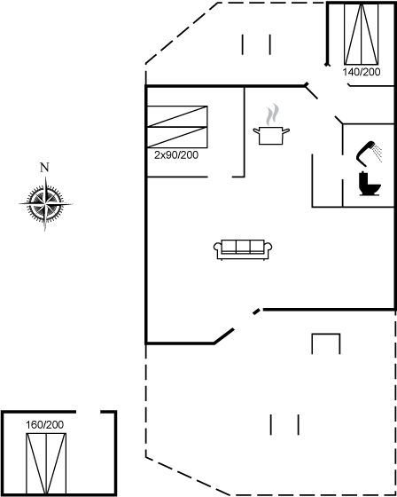 Huset og haven er meget velplejet, og den store græsplæne indbyder til leg og spil. Der er to gode træterrasser, og på den sydvendte terrasse er en del tillige overdækket. Køkkenet er i åben forbindelse med spisepladsen og stuen, hvorfra der er udgang til den ene terrasse. I huset er der 2 soveværelser med hver 2 sovepladser, og derudover er der 2 sovepladser i annekset, som ligger i forbindelse med carporten. Badeværelset er med bruseniche og vaskemaskine.